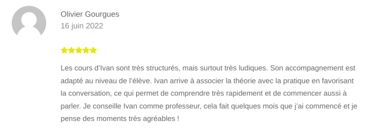Avant l’existence du système d’avis de Google j’utilisais cette petite enquête pour évaluer le niveau de satisfaction de mes apprenants. Jusqu’à présent 28 sur 28 m’ont donné un avis positif. 100% de clients satisfaits ✅