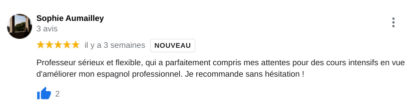 Je reçois aussi des avis via le petit annonce de mes cours d’espagnol sur Quefaire. Jusqu’à présent 100% de clients satisfaits ✅